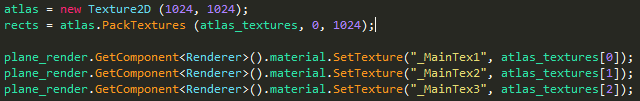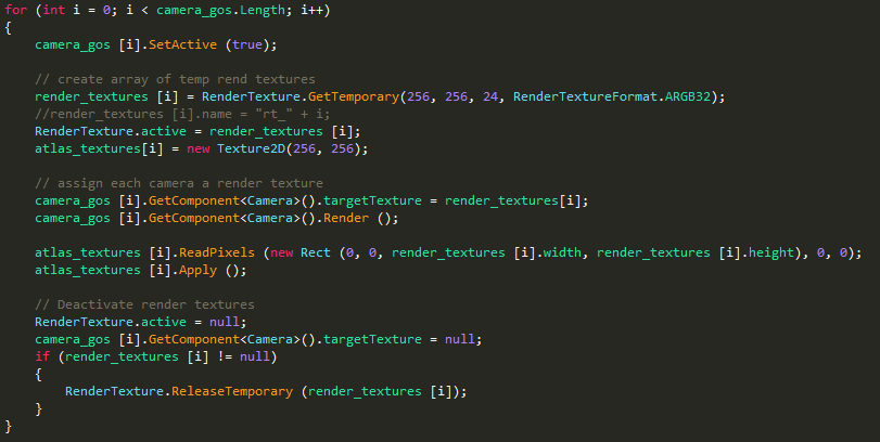 After having the cameras all take their own render texture, I placed them all in an array and compressed them into a texture atlas. From there I can apply them into a 3-way blend shader like below
